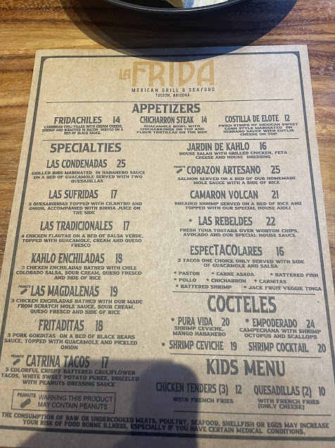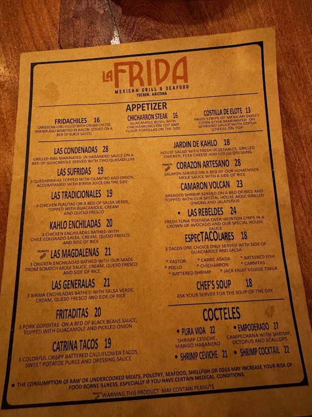 Welcome to La Frida Mexican Grill & Seafood Restaurant, where bold Mexican flavors meet fresh seafood excellence. Our La Frida Mexican Grill & Seafood Restaurant menu offers a delicious selection of traditional Mexican dishes, sizzling grill favorites, and carefully prepared seafood specialties. Whether you’re craving tacos, enchiladas, mariscos, or signature house plates, La Frida delivers authentic taste, quality ingredients, and a welcoming dining experience every time.